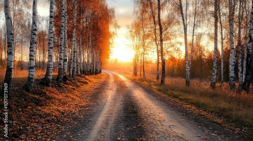 Obraz premium Warm sunlight shining through birch trees along a rural path at sunset