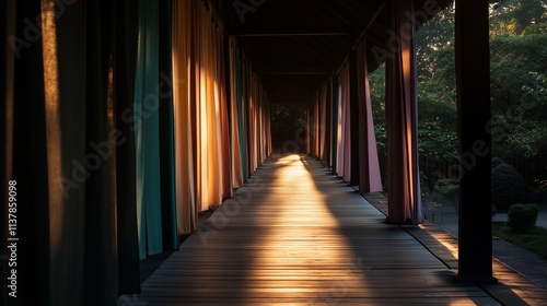 Fototapeta premium Warm sunlight streams through curtains in a tranquil corridor surrounded by nature