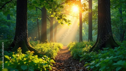 © Hugnaka, Naklejka premium Warm sunlight streams through leaves onto a forest floor, illuminating dappled shadows and lush greenery Perfect for nature, ecology, and environmental themes , natural, forest floor
