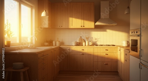 © jervinjerkaeffmason, Fototapeta premium Warm Sunny Kitchen Interior with Wooden Cabinets and Window Light.