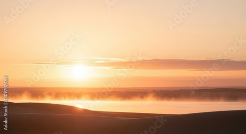 Naklejka premium Warm sunrise over a misty landscape golden light reflecting on the water creating a serene and peaceful atmosphere