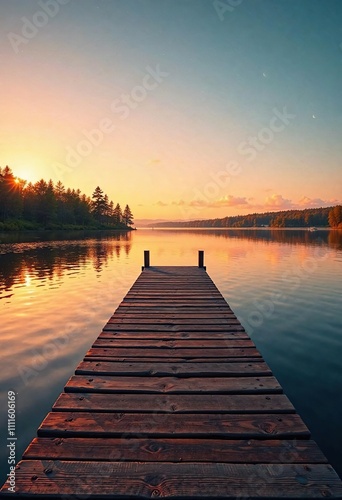© Maneerat, Fototapeta premium Warm sunset colors on a wooden dock at a lake, green, pink
