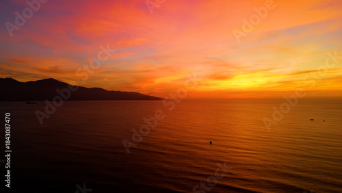 © NK_Media, Naklejka premium Warm sunset illuminating da nang coastline, golden light painting tranquil waters with mountain silhouettes against dramatic vietnamese seascape