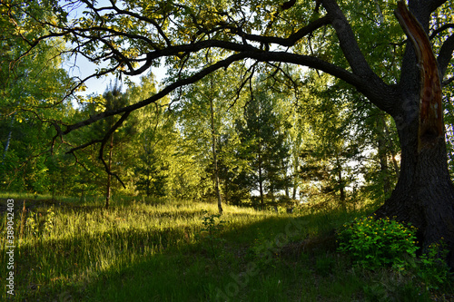 Fototapeta premium warm sunset in the green summer forest