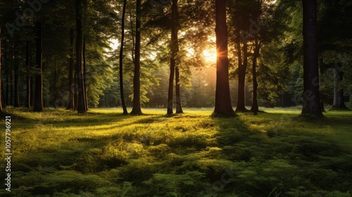 Obraz premium Warm sunset light highlighting green grass in a summer woodland