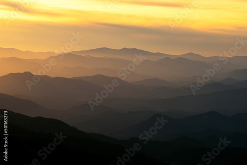 Fototapeta premium Warm sunset light illuminating many layers of ridges in the Great Smoky Mountains National Park