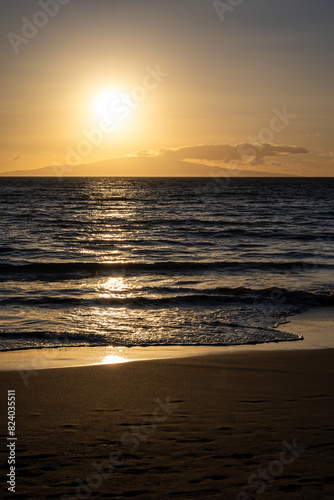 Naklejka premium Warm sunset over the Pacific Ocean from the beach at Kihei, Maui, Hawaii, as...