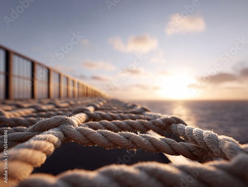 © SolaruS, Obraz premium Warm sunset seascape with blurred railing, and a knotted rope foreground. Evokes themes of travel, stability, journeys and the sea. Great for backgrounds and text overlays.