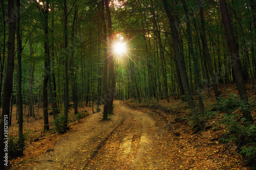 Fototapeta premium Warm sunset with sunbeams over a forest with dirty road