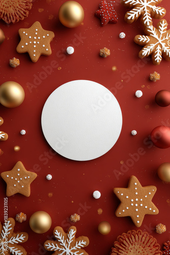 © wolfhound911, Fototapeta premium Warm-toned festive border of cookies, baubles, and snowflakes forming a circular focal point in vertical orientation