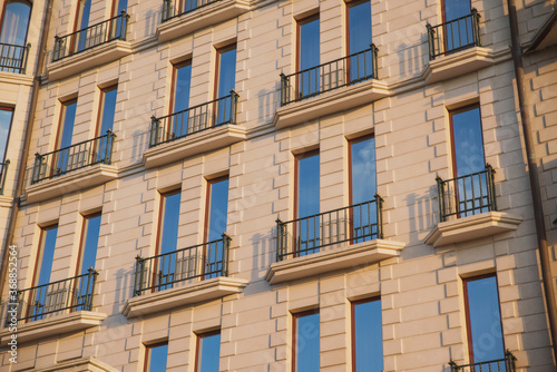 © Антон Фрунзе, Fototapeta premium warm tones building texture with blue sky reflection in windows