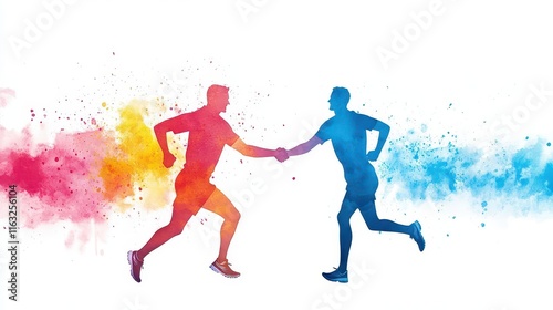 © taweesak, Fototapeta premium Warm watercolor of a supportive handshake between two runners in midrace