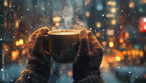© kadek, Fototapeta premium Warm Winter Drink in Snowy Cityscape: Cozy Night Comfort with Steaming Mug and Gloves.