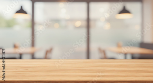 Obraz premium Warm Wood Table, Cafe Blurred Background AI Generated