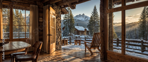 © bluebeat76, Obraz premium Warm wooden chalet interior opening onto snowy mountain view