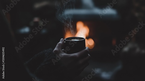 Fototapeta premium Warmth and Comfort: A steaming mug near a cozy fireplace on a cold evening
