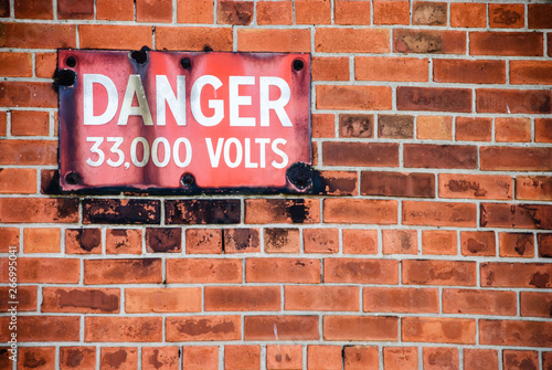 © Stephen, Obraz premium Warning sign outside an electricity substation saying "Danger, 33,000 volts"