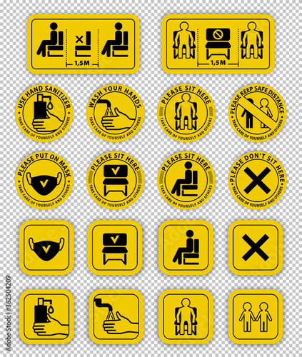 Obraz premium Warning signs on transparent background.. Keep distance between people. Do not sit here. Keep safe distance. Wash your hands