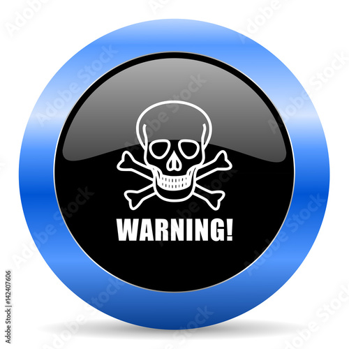 © Alex White, Fototapeta premium Warning skull black and blue web design round internet icon with shadow on white background.