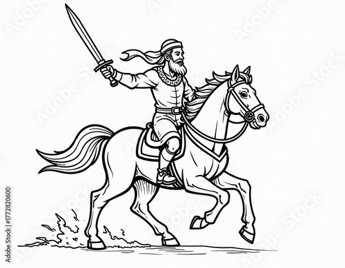 Fototapeta premium Warrior Rider on Horse with Sword - Black and White Line Art