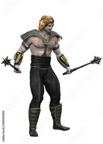 Obraz premium Warrior stands wielding spiked maces in both hands. He wears detailed armor on shoulders, forearms, and legs, with a muscular build and long, embodying strength and combat readiness. 3D Illustration