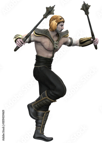 © AnnaPa, Fototapeta premium Warrior stands wielding spiked maces in both hands. He wears detailed armor on shoulders, forearms, and legs, with a muscular build and long, embodying strength and combat readiness. 3D Illustration