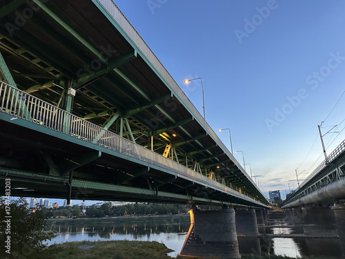 © Sniezka, Obraz premium Warsaw, Poland - September 24, 2025: Underneath a large green bridge at dusk, showcasing its structural design and reflections on the water below, highlighting urban architecture and engineering