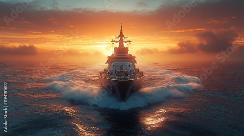 © Design By Reiga, Obraz premium Warship sailing at sunset, ocean waves, dramatic sky.