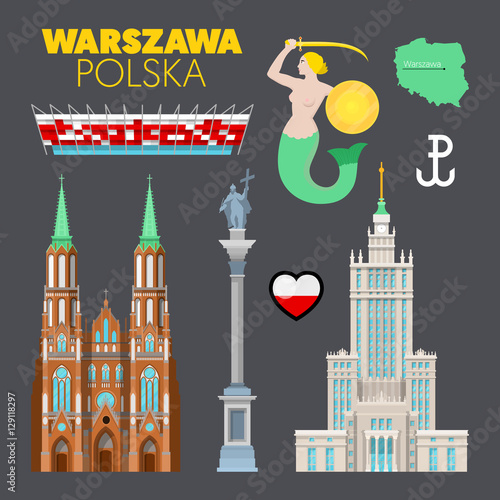 Obraz premium Warszawa Polska Podróż Doodle z warszawską architekturą, symbolem Syrenki i flagą. Ilustracji wektorowych