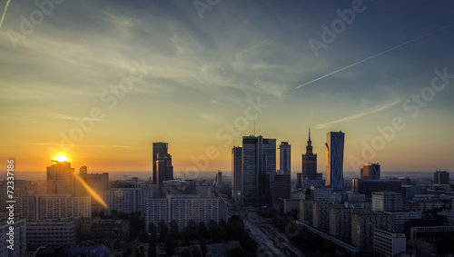 © marchello74, Obraz premium Warszawski śródmieście wschodu słońca widok z lotu ptaka, Polska