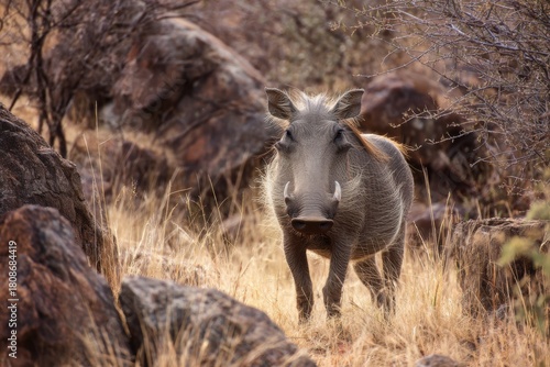 Fototapeta premium Warthog exploring rocky terrain in a protected wilderness area during the...