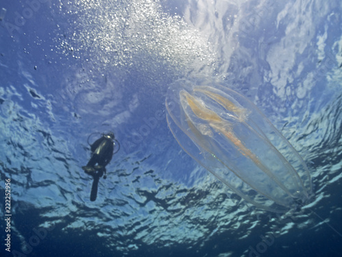 Obraz premium Warty comb jelly and scuba diver, Rippenqualle und Taucher (Mnemiopsis leidyi)