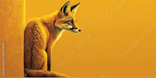 Fototapeta premium Wary fox peeks around yellow corner on plain background, concept of Watchful and Inquisitive, created with Generative AI technology