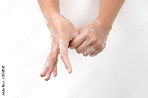 © ltyuan, Fototapeta premium Washing hands with soap on light background. Personal hygiene concept.