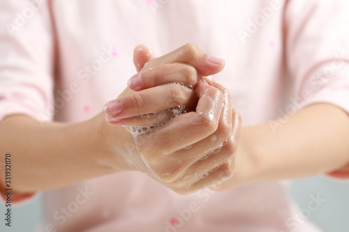 © ltyuan, Fototapeta premium Washing hands with soap on light background. Personal hygiene concept.