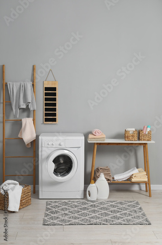 © New Africa, Obraz premium Washing machine, ladder, detergents, basket, laundry and storage bench indoors