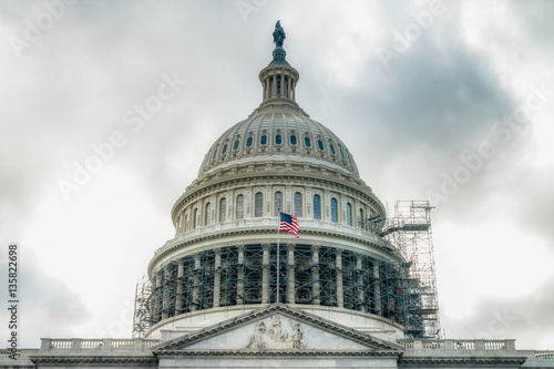 Obraz premium WASHINGTON DC, USA The United States Capitol view from the street. In 2014, scaffolding was erected around the dome for a restoration project scheduled to be completed by 2017.