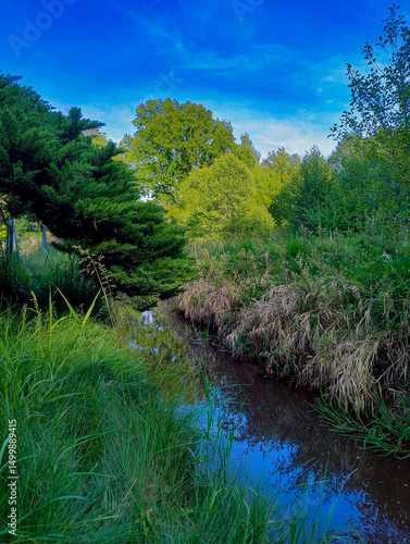 © boguslavus, Fototapeta premium Wąski strumień płynący wśród zarośli. Brzegi porasta wysoka zielona trawa. Z lewej strony nad strumieniem wisi gałąź jałowca. W oddali widać wysokie drzewa. Niebo jest bezchmurne.