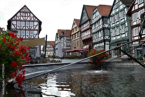 © SiRo, Naklejka premium Wasser im Marktbrunnen mit Fachwerkhäusern am Marktplatz in Fritzlar