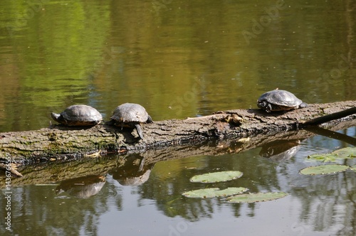 Fototapeta premium Wasserschildkröten auf Ast im Teich auf Ohlsdorfer Friedhof