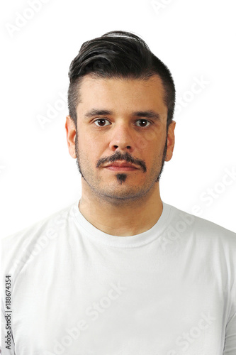 © Daniel Rodriguez, Obraz premium Wąsy mężczyzna i biała koszula z białym tłem