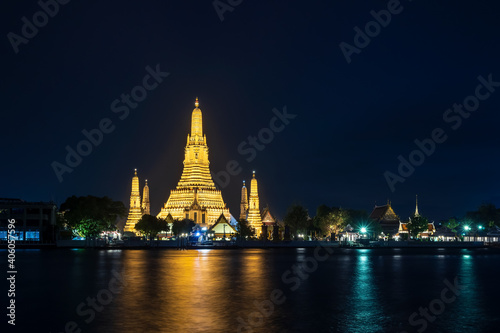 Obraz premium Wat Arun Ratchawararam (Temple of Dawn) and five pagodas at night, famous...
