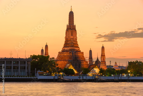 Obraz premium Wat Arun Temple at sunset in Bangkok, Thailand. Location in public area.