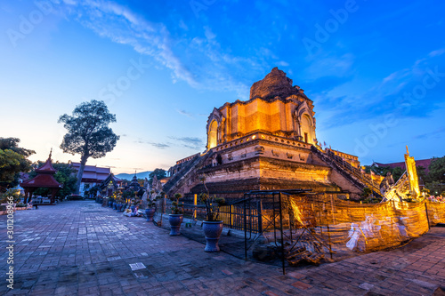 © Thinapob, Fototapeta premium Wat Chedi Luang is a Buddhist temple in the historic centre and is a Buddhist temple is a major tourist attraction in Chiang Mai,Thailand.at twilight time blue sky clouds sunset background.
