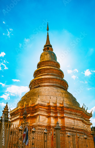 Naklejka premium Wat Phrathat Haripunchai Woramahawihan during Loy Khratong lantern festival in Lamphun, Chiang Mai, Thailand