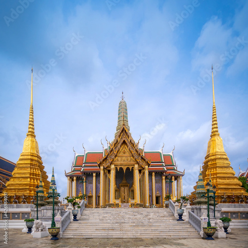 © pomphotothailand, Fototapeta premium Wat Pra Kaew w Wielkim Pałacu Świątynia Szmaragdowego Buddy (pełna oficjalna nazwa: Wat Phra Si Rattana Satsadaram) to charakterystyczne i słynne miejsce, będące celem podróży w Bangkoku w Tajlandii.