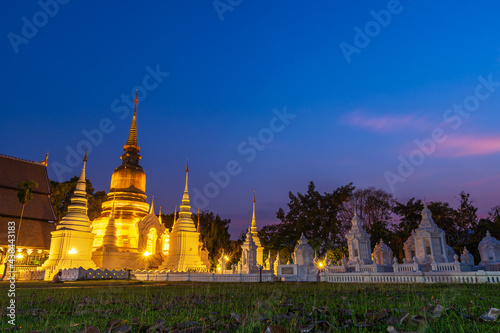 Naklejka premium Wat Suan Dok is a Buddhist temple (Wat) at twilight sunset sky background is a major tourist attraction in Chiang Mai Northern Thailand.Travels in Southeast Asia.