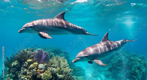© Faruk, Naklejka premium Watch playful dolphins swimming in crystal clear blue ocean near vibrant coral reefs, a serene marine life scene