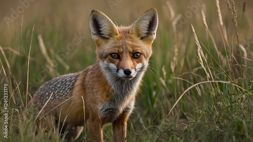 Obraz premium Watchful Eye: A Kit Fox Camouflaged in the Field, Ready to Pounce