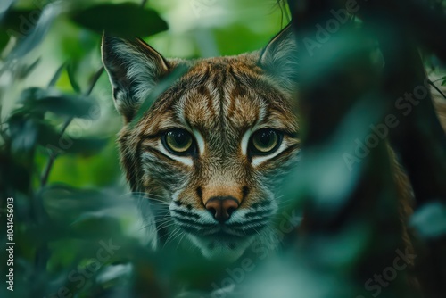 Fototapeta premium Watchful lynx peering through forest undergrowth.